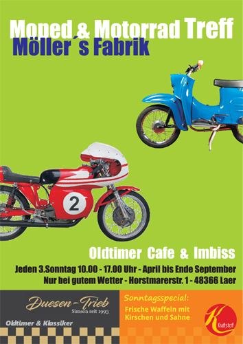 Jeden 3.Sonntag wird aus unserem Laden mit Werkstatt unser kleines „Motorradmuseum“ und öffnet seine Türen in der alten Möllers Fabrik um alle Zweiradfans willkommen zu heißen.